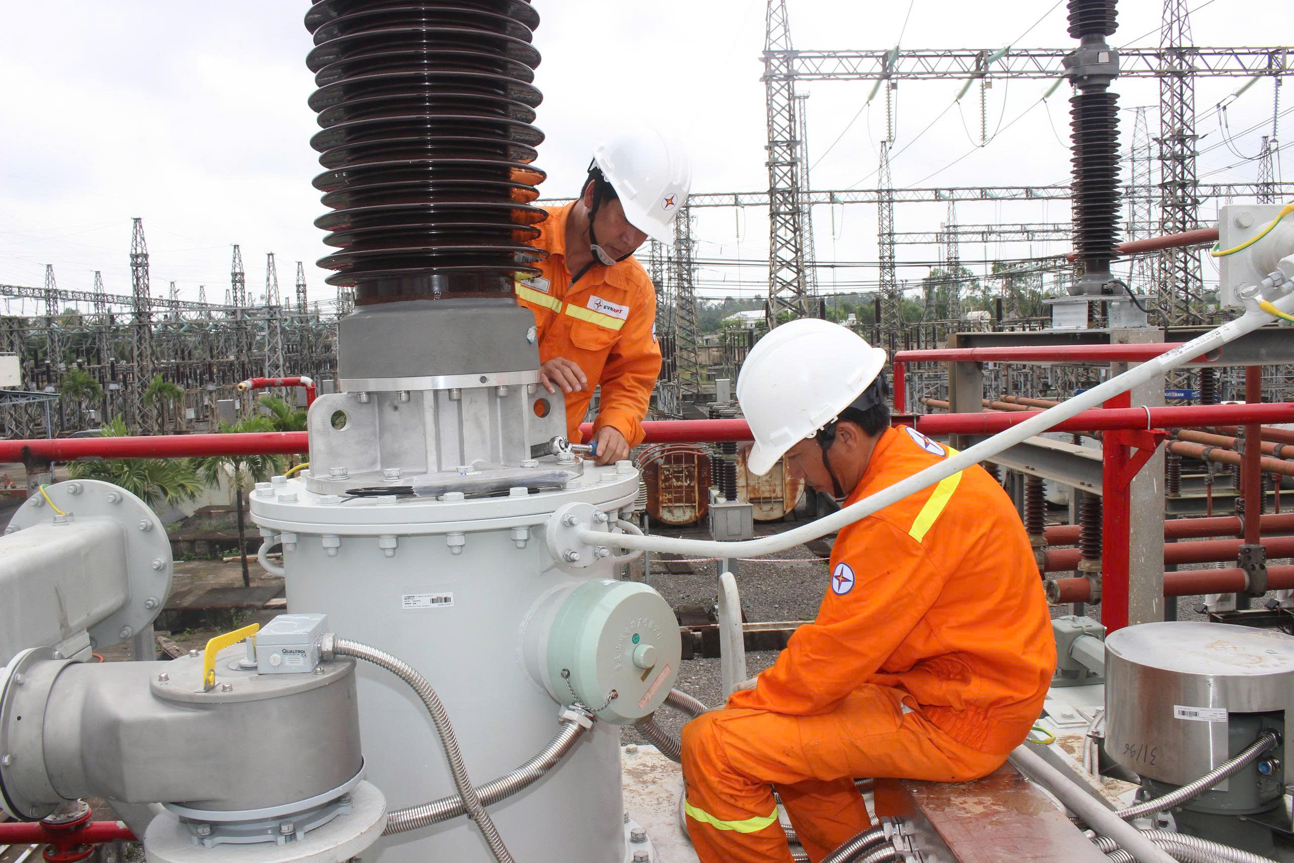 Công nhân TBA 500 kV Đà Nẵng (TTĐ Đà Nẵng) kiểm tra thiết bị trước khi đóng điện.