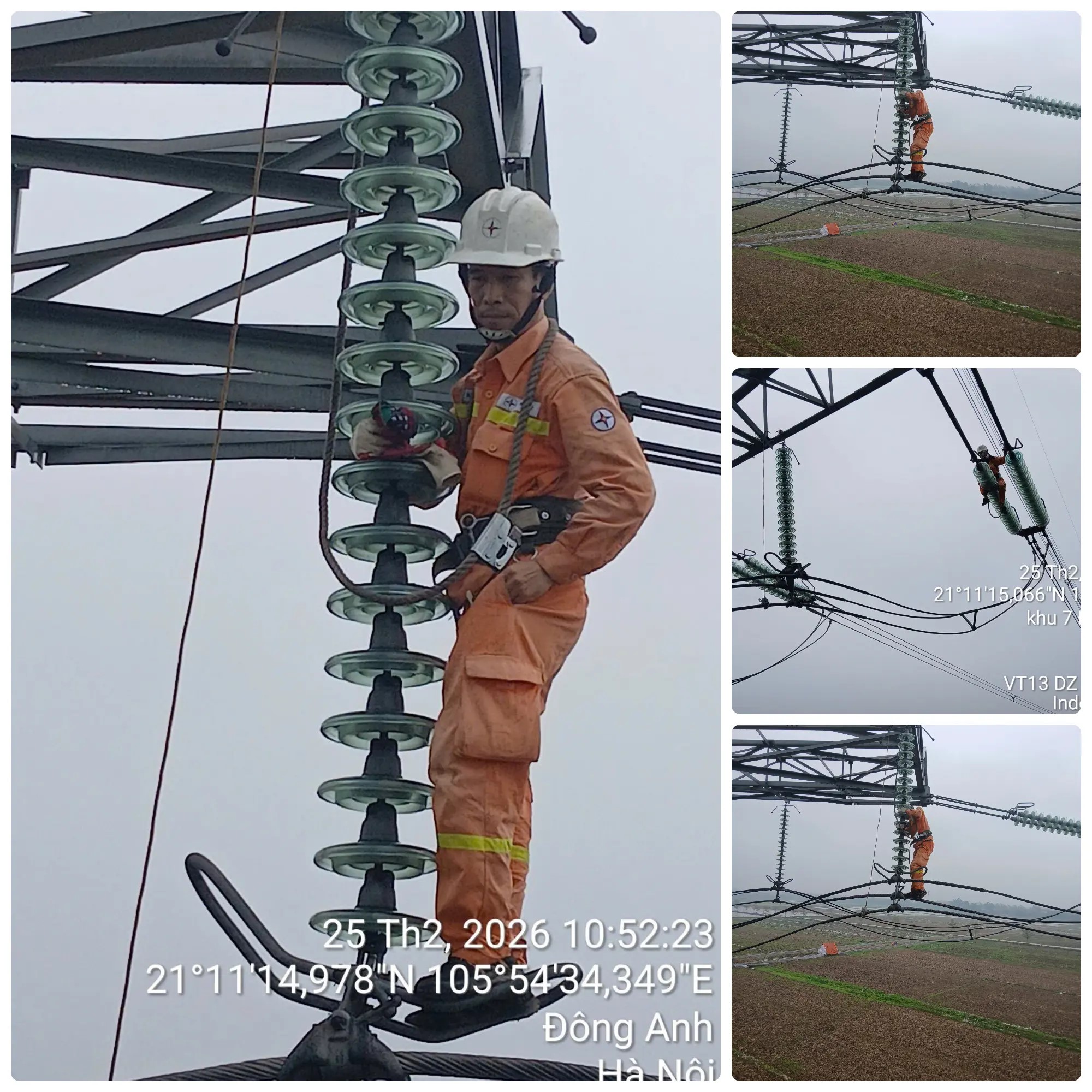 Tiếp đó, ngày 25/02/2026, đơn vị đã đăng ký cắt điện đường dây 220kV 272 Đông Anh – 271 Bắc Ninh 3 để triển khai vệ sinh cách điện, kiểm tra phụ kiện, thay thế cách điện hư hỏng và sửa chữa phần điện. Công tác chuẩn bị được thực hiện bài bản, khoa học; Tổ quản lý vận hành Đường dây Hà Nội 2 đã xây dựng phương án thi công chi tiết, đánh giá đầy đủ các yếu tố phát sinh và nguy cơ mất an toàn, trình phê duyệt trước khi triển khai.