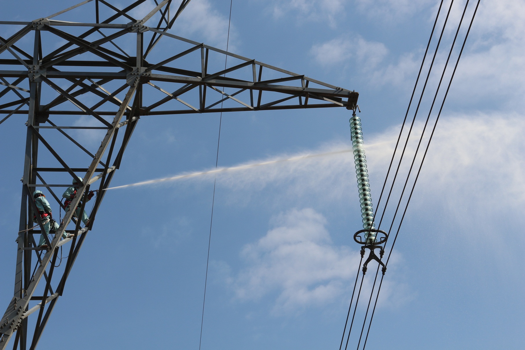 Công nhân tổ QLVH đường dây Kon Tum vệ sinh cách điện hotline trên tuyến đường dây 500kV mạch 1