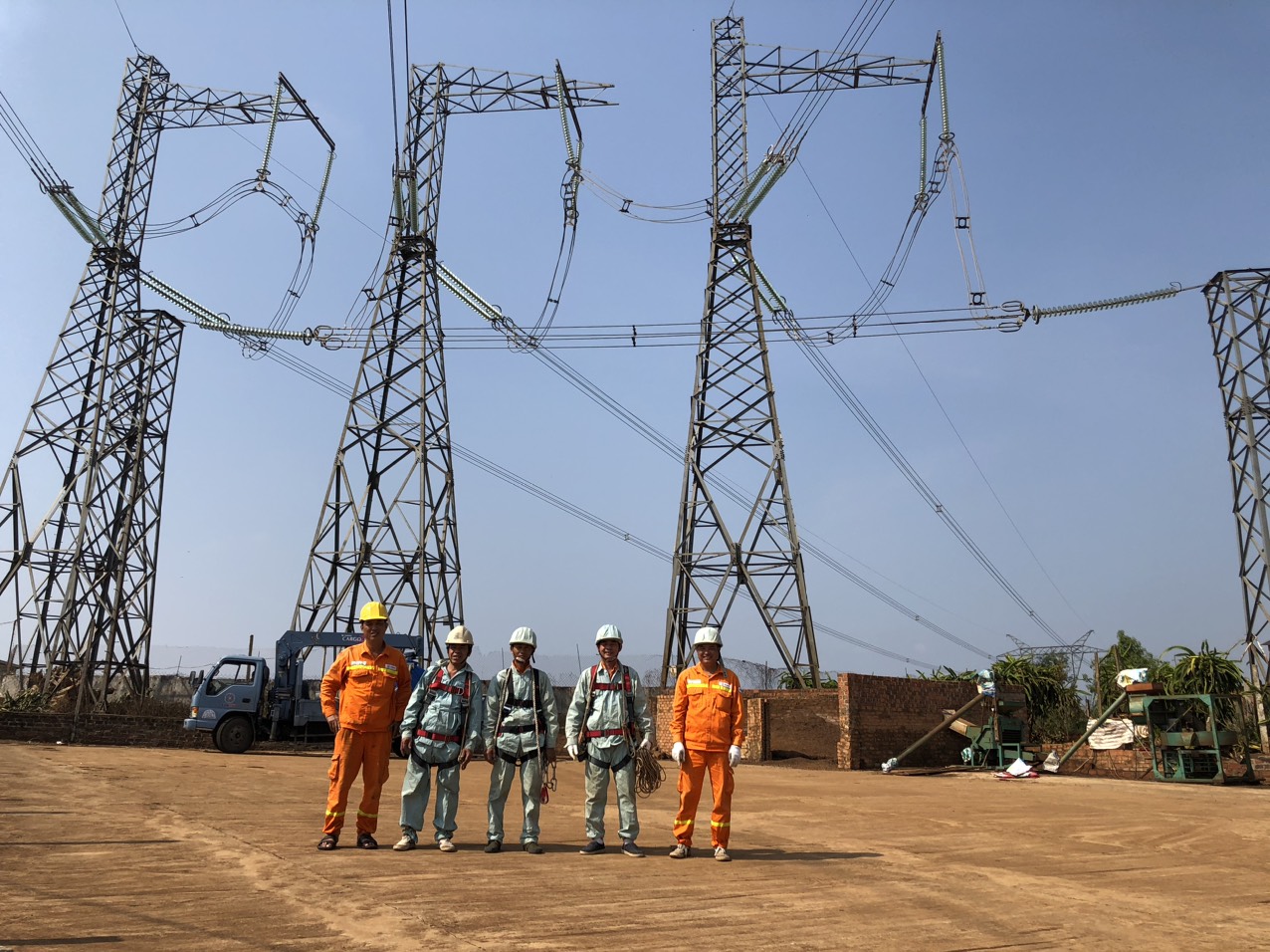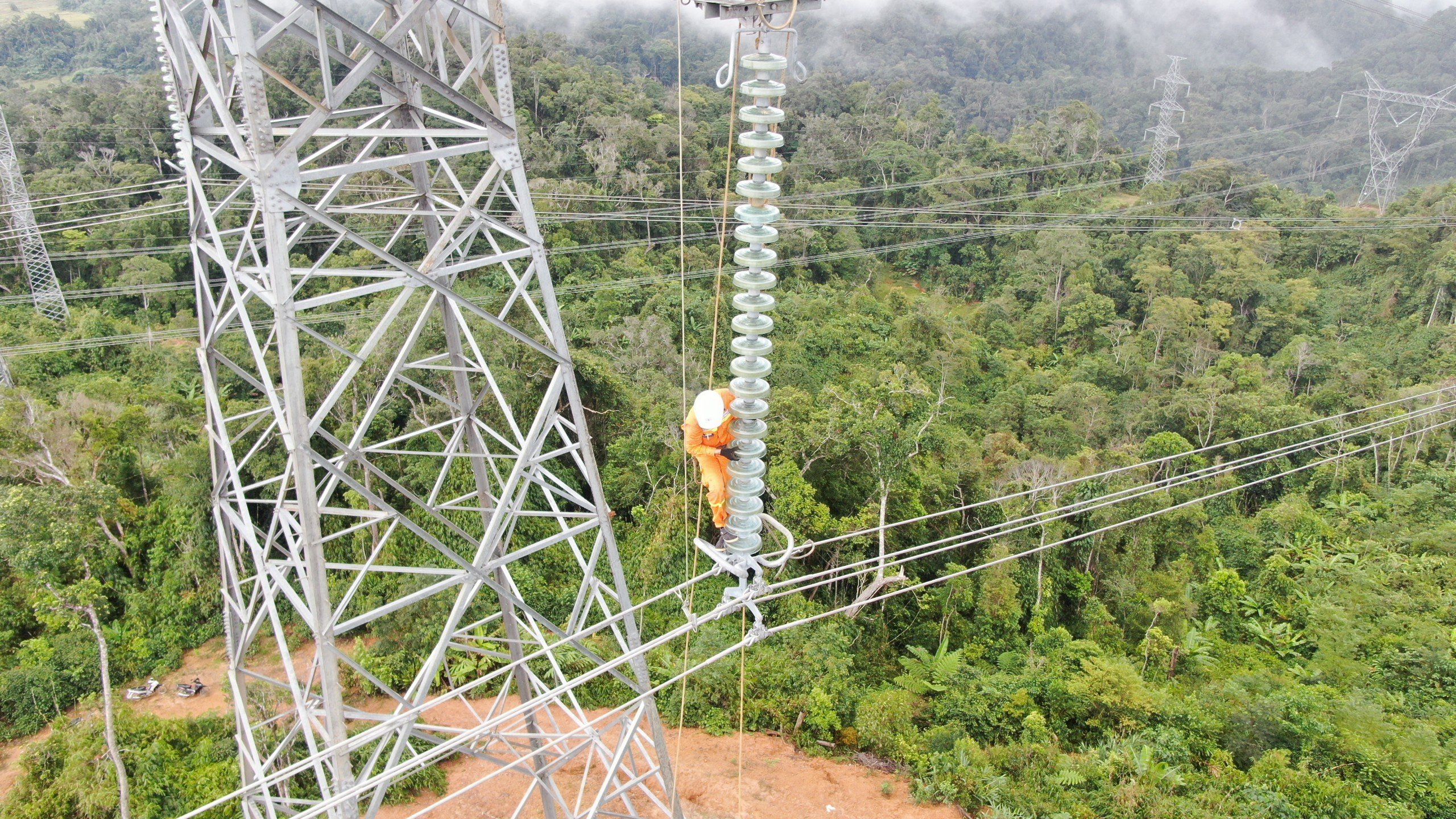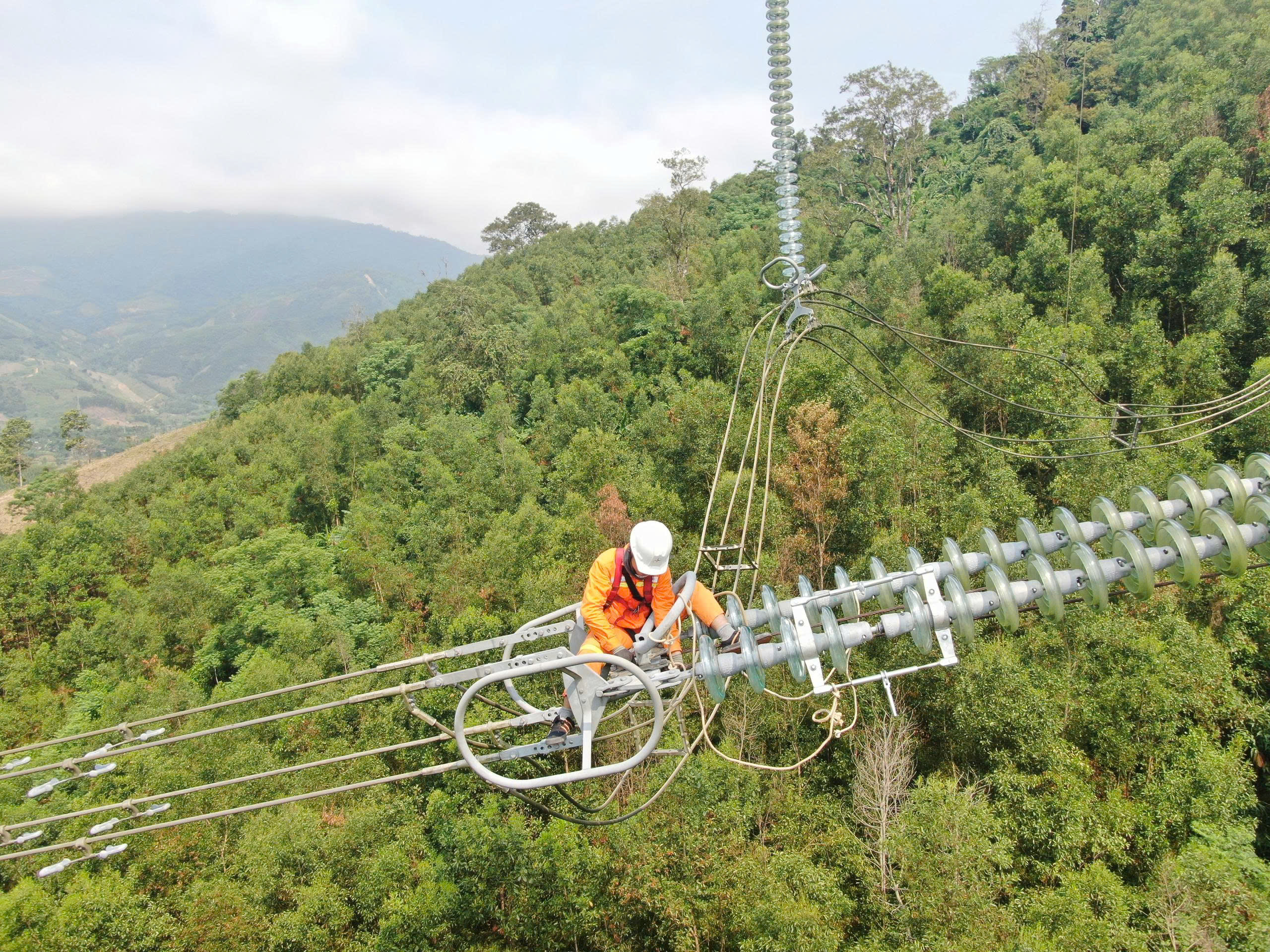 Công nhân tổ QLVH đường dây Kon Tum duy tu, bảo dưỡng thiết bị trên tuyến đường dây 500kV mạch 1