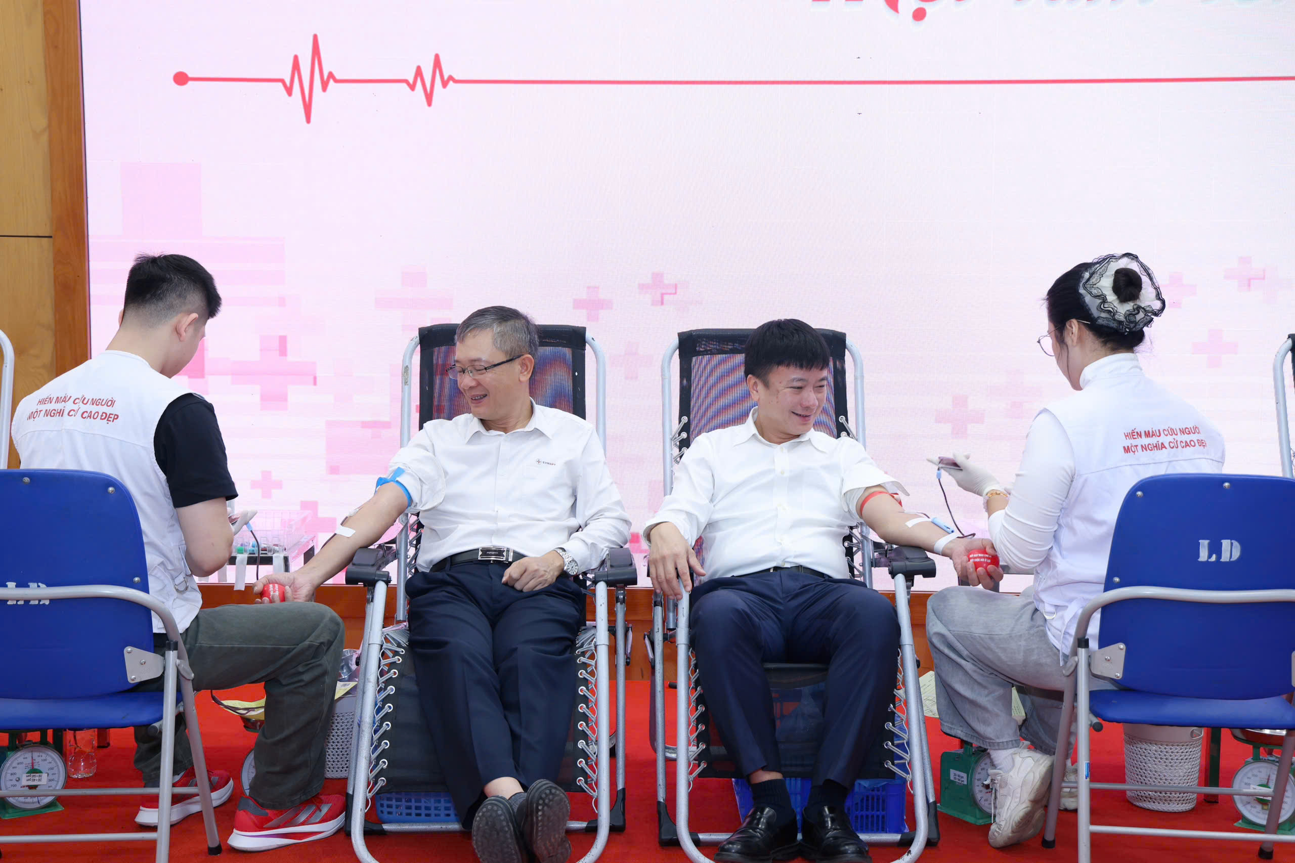 Phó Tổng giám đốc EVNNPT Nguyễn Ngọc Tân (bên trái) và Phó Tổng giám đốc EVNNPT Lưu Việt Tiến tham gia hiến máu