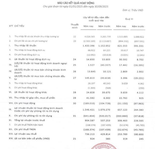 mục tăng mạnh như phát hành giấy tờ có giá tăng từ 18.556 lên 28.047 tỷ đồng, tương đương tăng 51%; Tiền gửi và vay các TCTD khác tăng từ 11.734 lên 13.959 tỷ đồng. Vốn chủ sở hữu tại ngày 30/09/2025 đạt