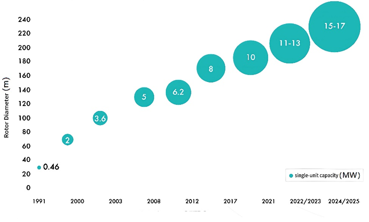 - Các yếu tố thúc đẩy và tình hình hiện tại: Việc tăng công suất tuabin là một trong những giải pháp hiệu quả nhất để giảm Chi phí điện năng quy dẫn (Levelized cost of energy - LCOE). Công suất lớn hơn đồng nghĩa với việc cần ít tuabin hơn cho các trang trại điện gió có cùng quy mô, qua đó giúp giảm thiểu đáng kể chi phí liên quan đến móng, lắp đặt, cáp và vận hành & bảo dưỡng. Hiện tại, các tuabin có công suất trên 10MW đã được sử dụng phổ biến ở các dự án điện gió ngoài khơi, các mẫu tuabin có công suất 15MW trở lên đã bước vào giai đoạn sử dụng thương mại và các nguyên mẫu công suất 20MW đang trong quá trình thử nghiệm. Đường kính rotor đã vượt quá 250 mét, diện tích quét tiếp tục được mở rộng và hiệu suất thu gió được cải thiện đáng kể.