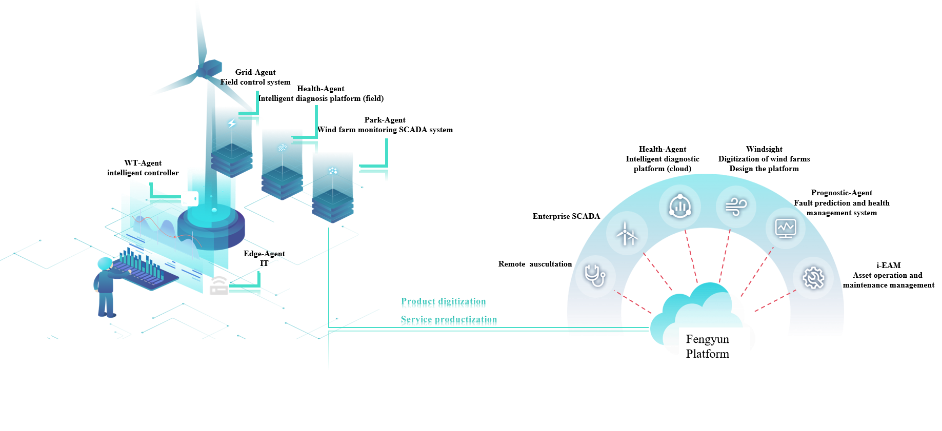 - Chuyển đổi sang vận hành & bảo dưỡng thông minh: Việc ứng dụng mạng lưới cảm biến tiên tiến, công nghệ giám sát và chẩn đoán tình trạng thiết bị (Condition Monitoring and Diagnostics - CM&D), phân tích dữ liệu lớn, trí tuệ nhân tạo và công nghệ bản sao số (digital twin) cho phép giám sát theo thời gian thực tình trạng của các bộ phận quan trọng của tuabin (như cánh tuabin, hộp số, máy phát, ổ trục), chẩn đoán lỗi sớm và chính xác, dự đoán tuổi thọ còn lại và thực hiện quản lý sức khỏe của thiết bị. Điều này thúc đẩy mô hình vận hành & bảo dưỡng chuyển sang hướng “bảo dưỡng dự đoán” và “bảo dưỡng chủ động”, từ đó cải thiện đáng kể hiệu quả vận hành & bảo dưỡng, độ sẵn sàng thiết bị và hiệu quả kinh tế của toàn trang trại điện gió.